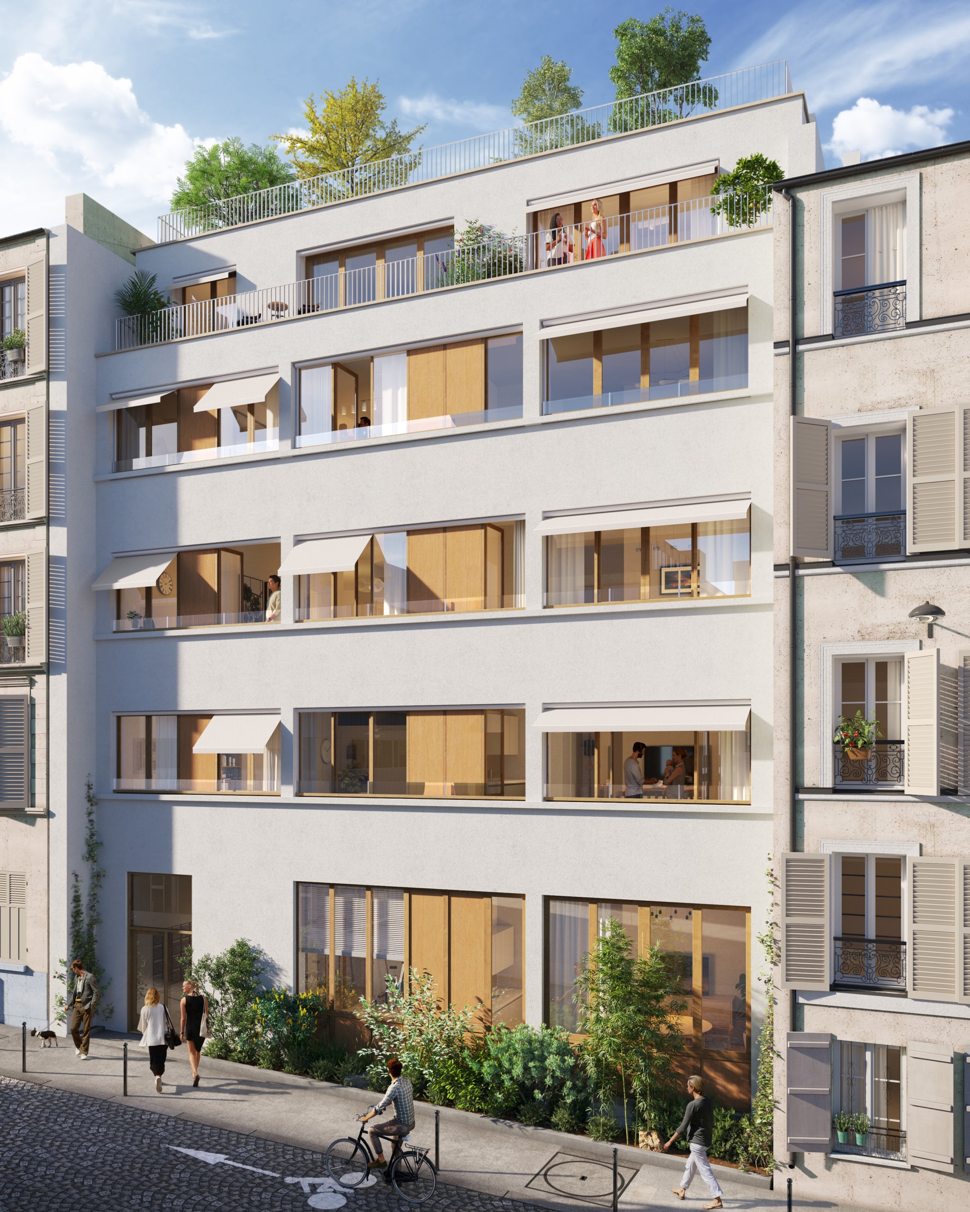 Les façades lumineuses sont sublimées par des matériaux nobles et la présence de terrasses, offrant aux habitants une vue imprenable sur les toits de Paris et le Sacré-Cœur.