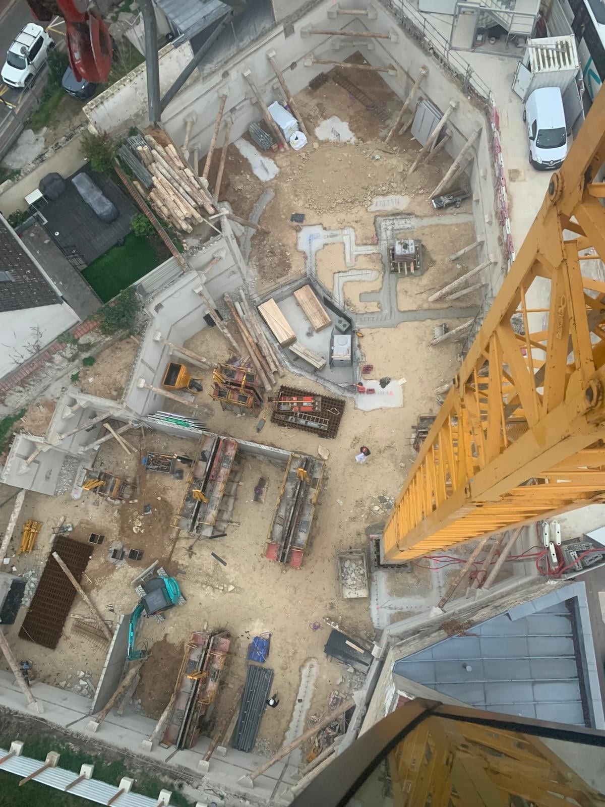 Vue de la grue : voiles et plancher haut R+4 en cours